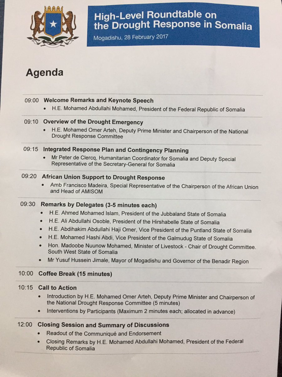Madaxda ka qeyb galeysa waxaa ka mida maamulada dalka, Gobolka Banaadir, wakiilada beesha caalamka iyo xukuumadda Soomaaliya, iyadoo la isku dhaafsan doono in wadajir ah loogu howlgalo wax ka qabashada abaaraha halakeeyay dalka.