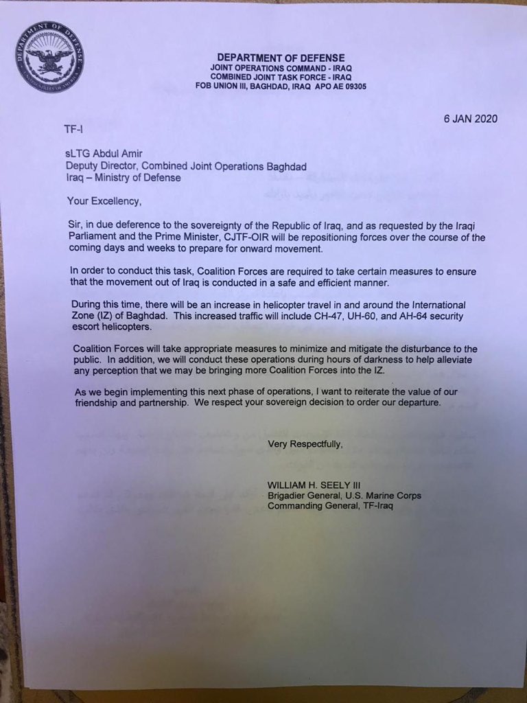 Taliyaha howlgallada wadajirka ah ciidamada Mareykanka Gen. William Seely ayaa qoraalkan u diray Wasaaradda Difaaca dalka Ciraaq, wuxuuna ku sheegay, iyadoo la tixgelinayo qaramimada Ciraaq iyo go’aankii Baarlamaanka dalkaasi ku gaaray in ciidamada shisheeye ay ka baxaan dalkaasi in taliska ciidamada wadajirka ah uu bilaabayo in maalmaha iyo toddobaadyada soo socda la daadgureeyo ciidamada ku sugan Ciraaq.