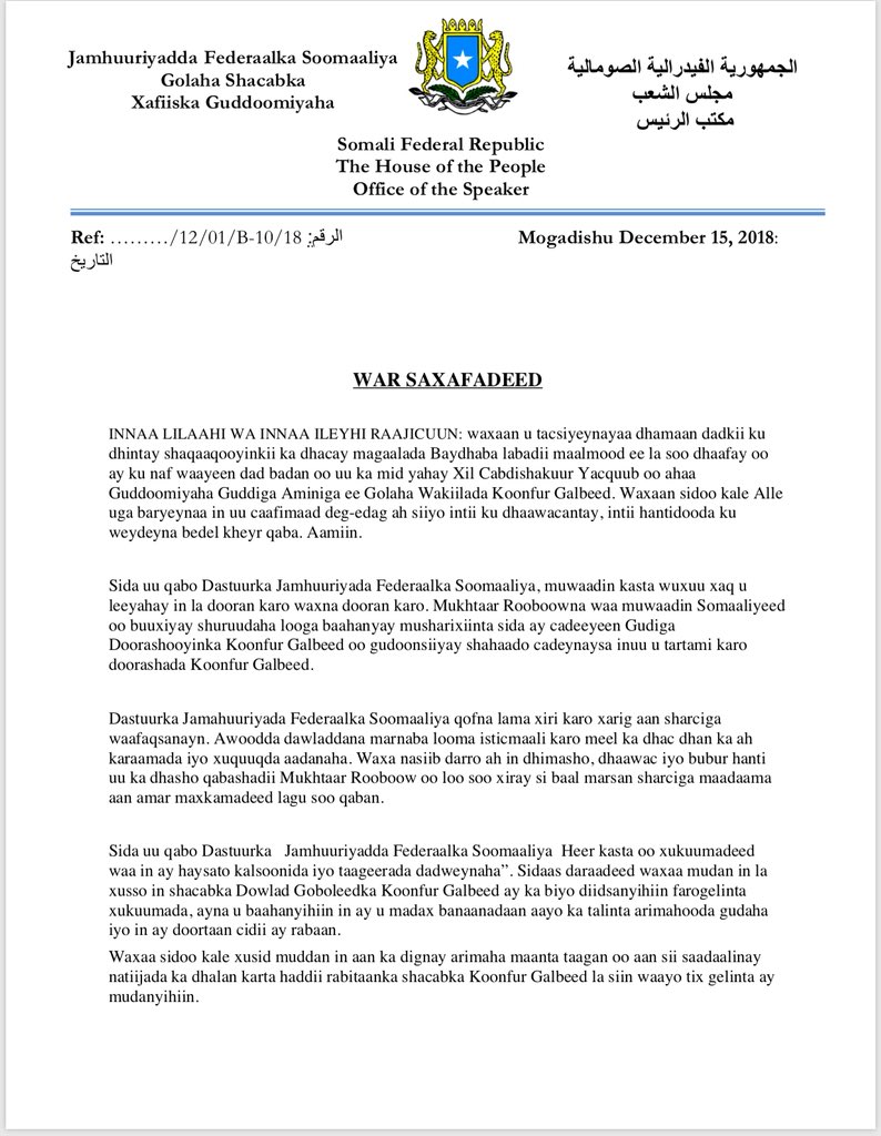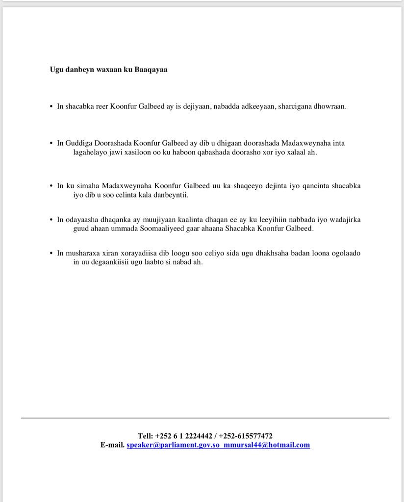 Guddoomiyaha Baarlamaanka Soomaaliya Maxamed Mursal Sheekh ayaa shan qodob kasoo saaray doorashada Maamulka K/Galbeed iyo Xariga Sheekh Mukhtaar Roobow Cali.