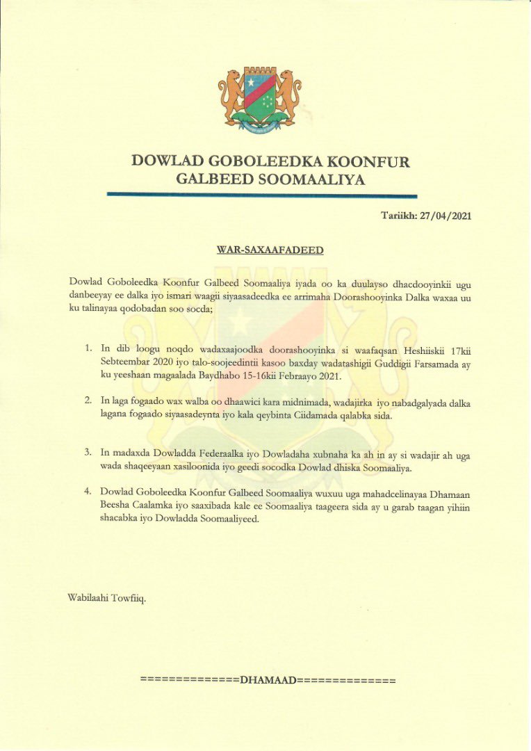 1. In dib loogu noqdo wadaxaajoodka doorashooyinka si waafaqsan heshiiskii 17kii Sebteembar 2020 iyo talo-soojeedintii kasoo baxday wadatashigii Guddigii Farsamada ay ku yeeshaan magaalada Baydhabo 16kii Febraayo 2021.2.