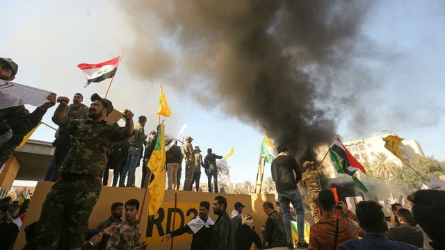 Wasiirada difaaca Ciraaq iyo arrimaha gudaha dalkaasi ayaa tegay xarunta safaaradda Mareykanka si ay xaaladda u qaboojiyaan, waxaana halkaasi ku qulqulay dadweyne kumanaan ruux ah, waxayna gubeen calankii Mareykanka, iyagoo gudaha u galay safaaradda.