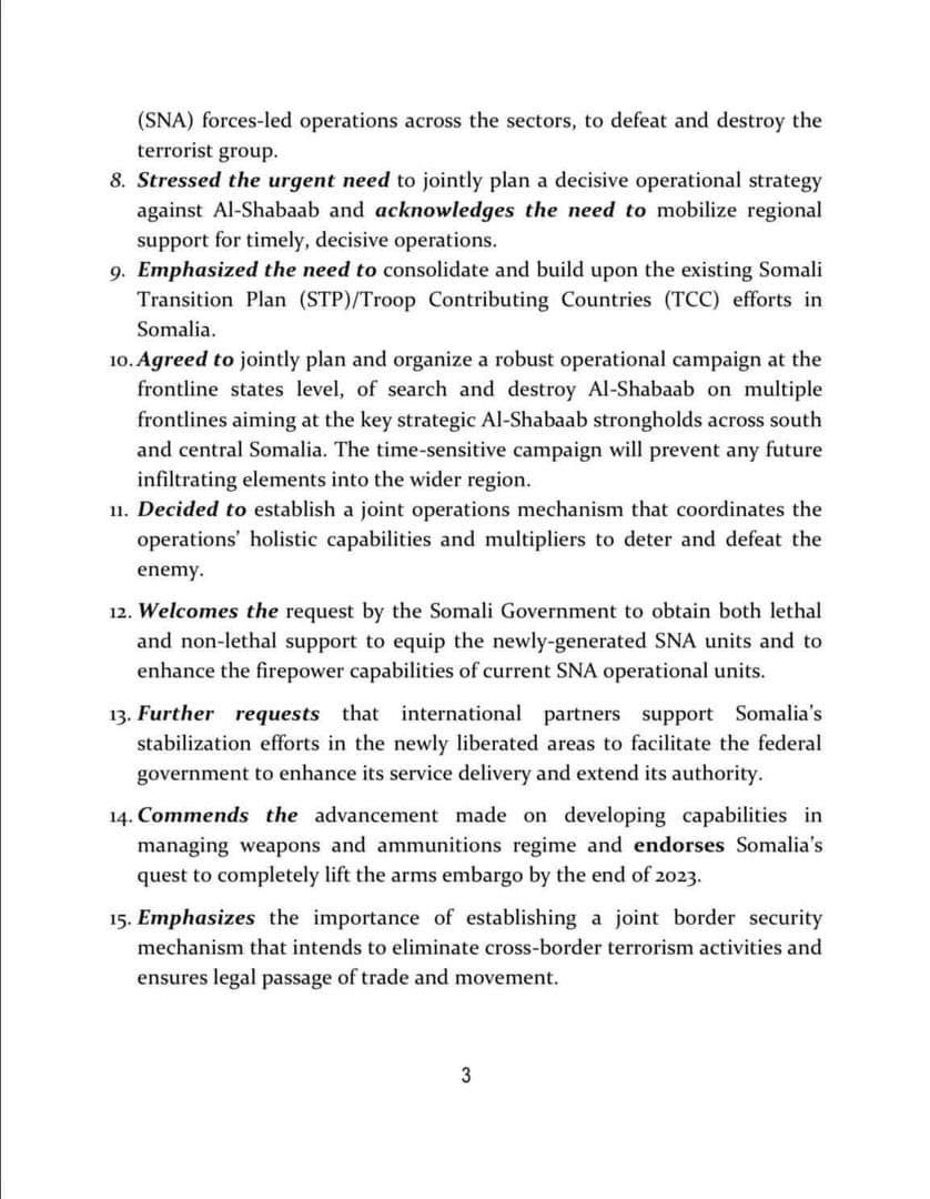 Waxay sidoo kale madaxda isku raaceen in la sameeyo howlgal wadajir ah oo lagu qaadayo goobaha ay ku harsan yihiin argagixisada si gebi ahaanba Soomaaliya oo dhan looga xoreeyo Al-Shabaab, loona fududeeyo dhimista ciidamada ATMIS iyo in si tartiib tartiib ah mas’uuliyadda amniga Soomaaliya loogu wareejiyo ciidamada Soomaaliya.