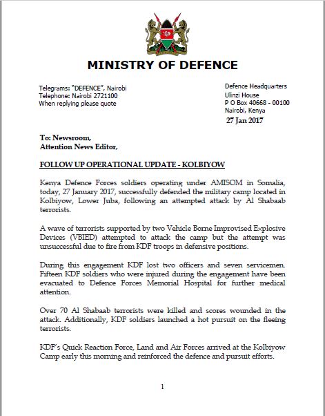 Bayaan kasoo baxay afhayeenka ciidamada Kenya ayaa lagu sheegay in dagaalkii ka dhacay Kulbiyow lagu dilay 9 askari (Laba sarkaal iyo 7 askari) oo ciidamada Kenya ka mida, laguna dhaawaqay 15 kale, iyadoo dhinaca Alshababa looga dilay 70 sida uu sheegay afhayeenka.