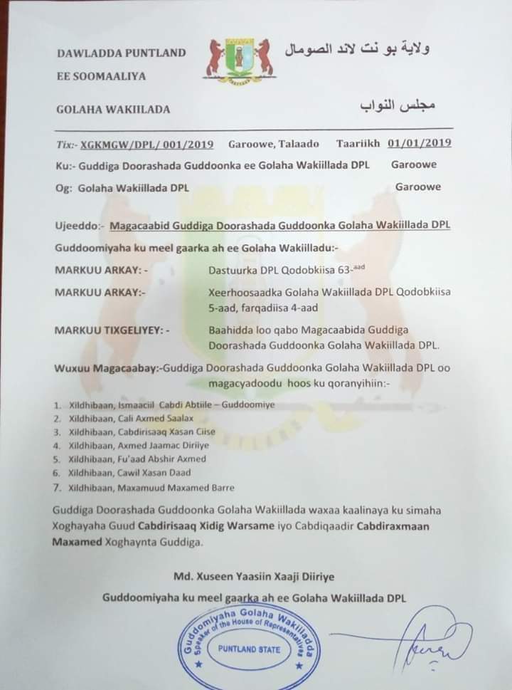 Golaha wakiilada Puntland ayaa magacabaay Guddiga Doorashada Guddoonka Golahaasi oo dhici doonta maalmaha soo socda.