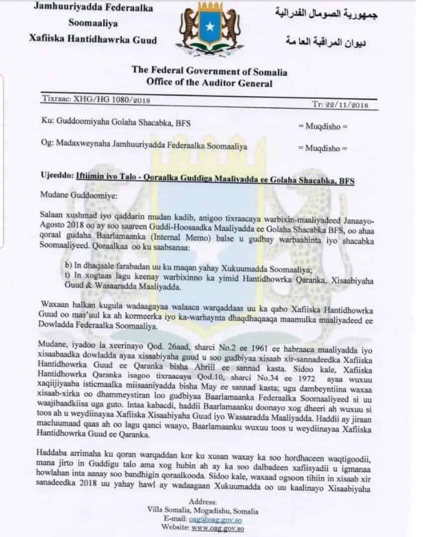 Qoraalka Hantidhowraha Guud ayaa loo diray Guddoonka Baarlamaanka Federaalka, waxaana cinwaan looga dhigay Iftiimin iyo Talo ayaa loo diray Gudoomiyaha Golaha Shacabka, iyadoo lagu ogeysiiyay Madaxweynaha, waxaana lagu sheegay in walaac uu ka qabo xafiiska Hanti dhowrka qoraalka ka soo baxay Guddiga Maaliyadda, isla markaana uu ahaa qoraal gudaha Baarlamaanka, balse u gudbay warbaahinta iyo shacabka Soomaaliyeed.