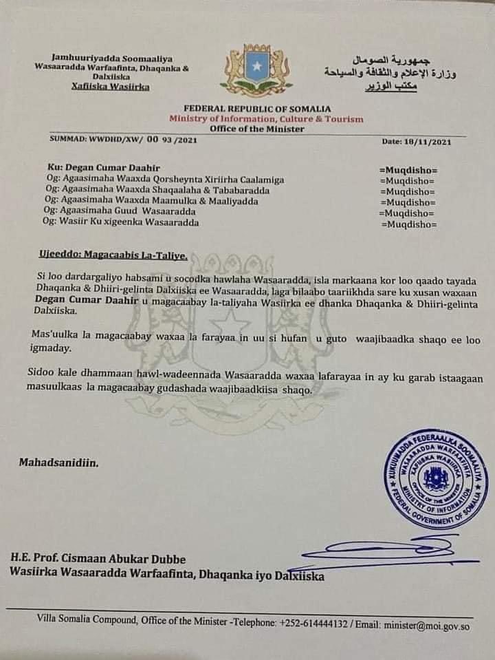 Xilka ayaa lagu magacaabay wareegto kasoo baxday Wsiirka Warfaafinta Cismaan Abuukar Dubbe.