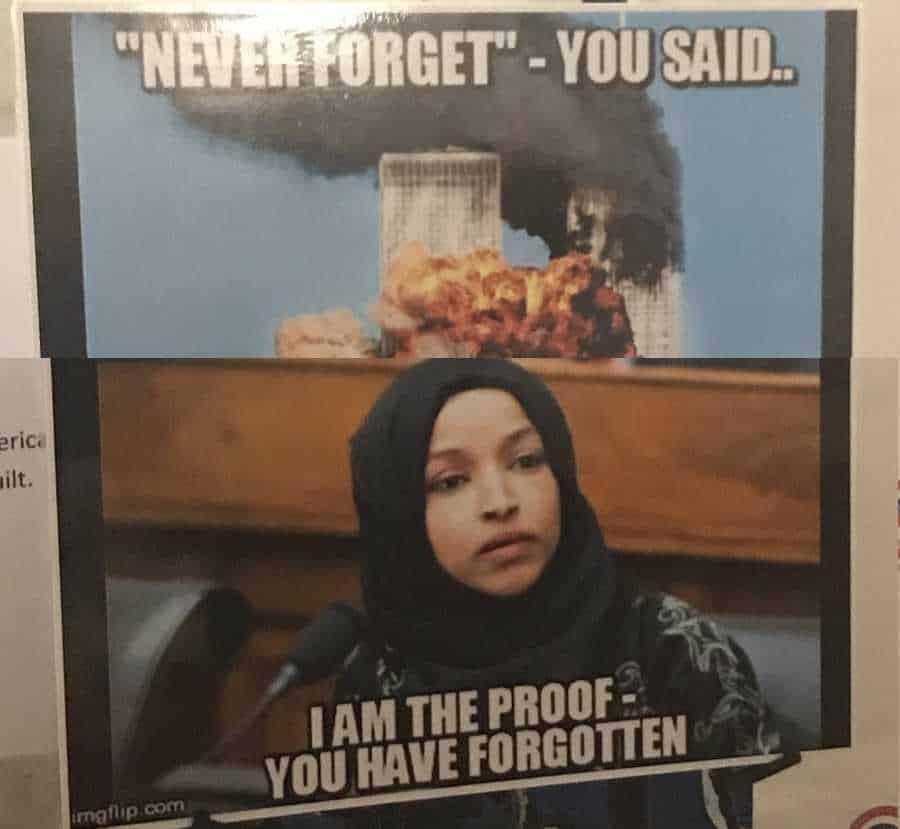Sawirka muranka weyn dhaliyey ayaa lagu arkay xarunta baarlamaanka Xisbiga Jamhuuriga ee magaalada Charleston, waxaana uu ahaa sawirka Ilhaan oo ay ka dambeeyaan daarihii mataanaha ahaa ee New York oo gubanaya, iyadoo lagu dul qoray oraah uu micnaheedu ahaa: “Waligiin ha illoobina – ayaad dhahdeen. Aniga ayaa caddeyn ah – waad illowdeen”.