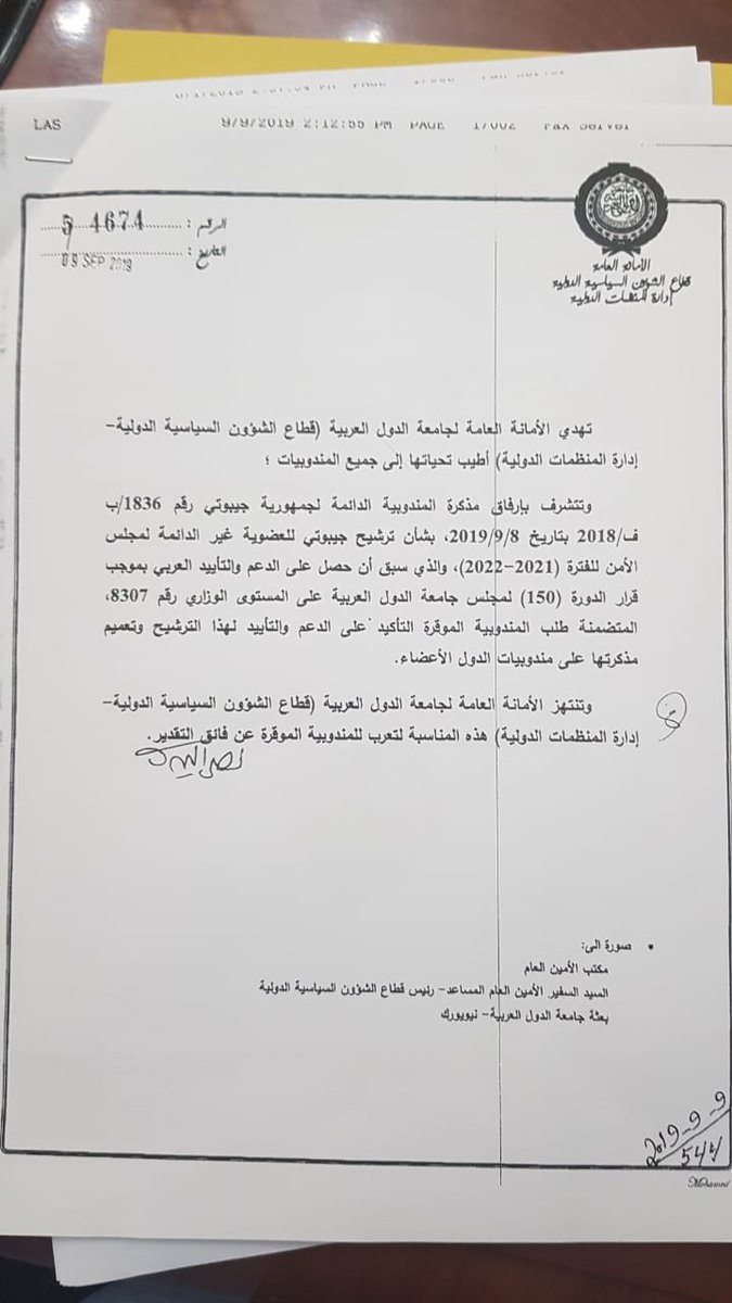 Jaamacadda Carabta ayaa si buuxda u taageertay tartanka ay dowladda Jabuuti ugu jirto kursiga aan joogtada ahayn ee Golaha Amniga Q/Midoobay ee sanadka 2021-2022.