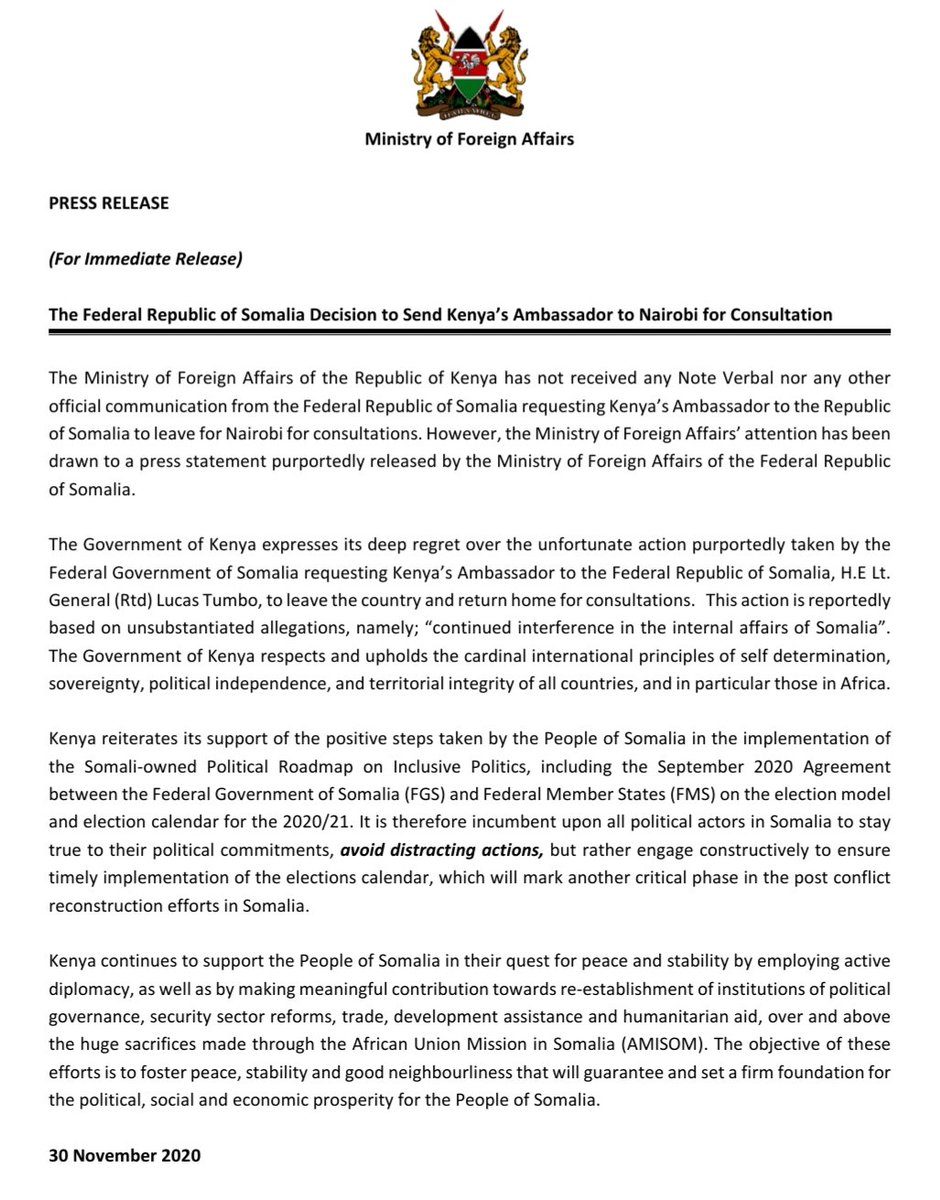 Dowladda Kenya yaa si rasmi ah uga jawaabtay Warkii kasoo baxay Wasaaradda Arrimaha dibadda Soomaaliya ee safiirka Keya looga dalabday inuu dalkiisa ugu laabto wadatashi looguna yeeray safiirka Somalia ee Nairobi.