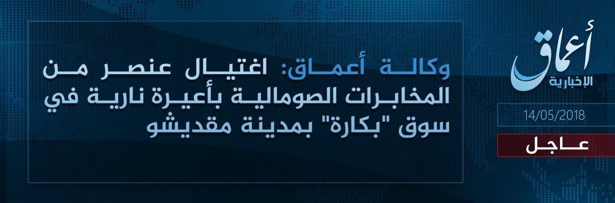 War kasoo baxay Wakaalada Wararka Daacish ee ACMAAQ ayaa lagu sheegay inay dil ku fuliyeen mid ka mida ciidamada Sirdoonka Soomaaliya ee NISA, iyadoo toogasho lagu dilay, waxayna arrintan caddeyn u tahay inay sii kordhayaan howlgallada Daacish ee Muqdisho.