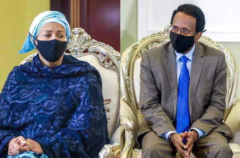 Ku-xigeenka Xog-hayaha Guud ee Q/Midoobay Amina Jane Mohamed ayaa maanta socdaal ku timid magaalada Muqdisho, iyadoo kulamo kala duwan la yeelatay, madaxweynaha xilligisu dhammaaday Maxamed C/llaahi Farmaajo, Ra’iisal wasaaraha xilgaarsiinta Maxamed Xuseen Rooble, Golaha Wadatashiga Qaran iyo dhicyada Haweenka dalka.