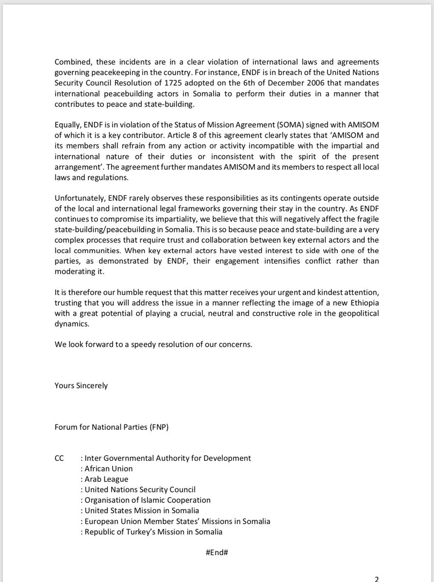 Qoraalka oo ka kooban 2 bog ayaa si toos ah ugu sovday Ra’iisal wasaare Abiy Ahmed, waxaana sidoo kale ogeysiin la siiyey ururadda IGAD, Midowga Afrika, ururka Islaamka, Jaamacadda Carabta, Midowga Yurub, Q/Midoobay, xafiiska UNSOM ee Soomaaliya iyo dowladda Turkiga, iyadoo lagu faahfaahiyey tallaabooyin ay ciidamada Itoobiya ku lug yeesheen oo ka dhacay Gobolka Gedo iyo faragelin toos ah oo ay ku yeesheen maamul goboleedyada dalka.