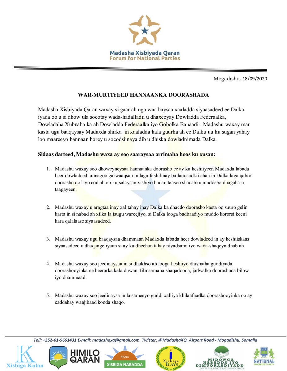 Madasha Xisbiyada Qaran ee ay hoggaamiyaan Madaxweynayaashii hore ee Shariif Sheekh Axmed iyo Xasan Sheekh Maxamuud ayaa War kasoo saartay heshiiska Doorashada ee ay gaareen Madaxda Dowlada Federaalka iyo Maamul Goboleedyada Dalka.