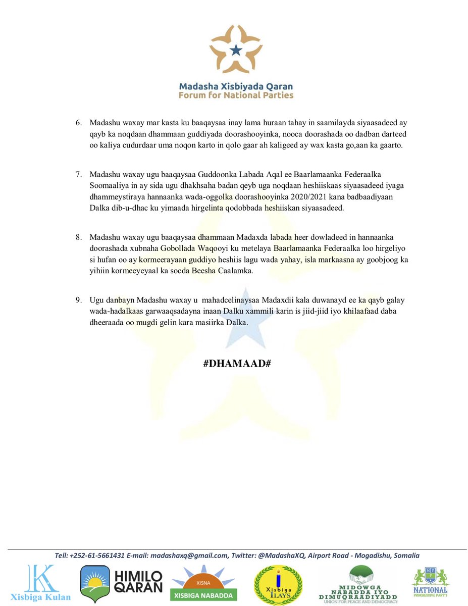 Madasha ayaa soo dhoweysay Hannaanka Doorasho ee lagu heshiiyay, waxayna caddeysay in lagu fashilmay ballanqaadkii in dalka laga qabto Doorasho Qof iyo Cod ah. War-murtiyeedka ayey Madashu ku baaqday laba qodob oo ka dhiman heshiiska, iyadoo ku baaqday: