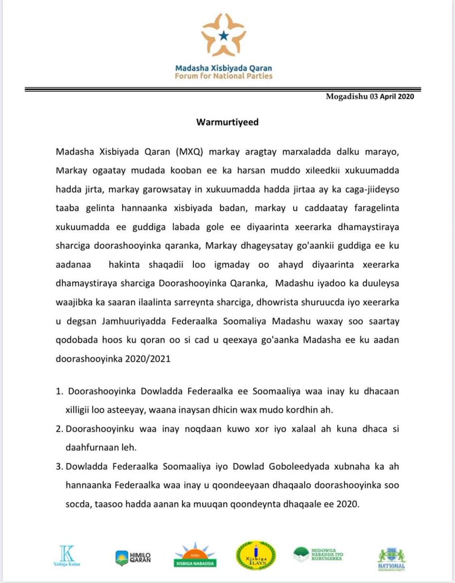 Mdasha Xisbiyada Qaran ee ay hoggaamiyaan madaxeynayaashii hore ee dalka Shariif Sheekh Axmed iyo Xasan Sheekh Maxamuud aaa War kasoo saaray Doorashooyinka Soomaaliya, iyagoo dalbaday inay ku dhacaan waqtigii loogu talo-galay.