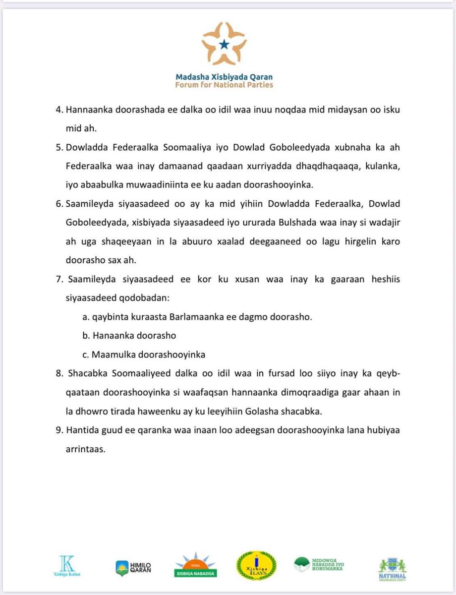 Madasha Xisbiyada Qaran ayaa sidoo kale dalbatay in saamileyda siyaasadeed oo ay ka mid yihiin dowladda federaalka, dowlad goboleedyada, xisbiyada siyaasadeed iyo ururada Bulshada ay si wadajir ah uga shaqeeyaan in la abuuro xaalad deegaaneed oo lagu hirgelin karo doorasho loo dhanyahay.