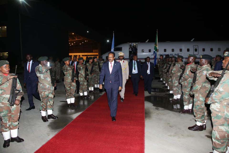 Wafdiga Madaxweyne Farmaajo oo ay ka mid yihiin Wasiirka Arrimaha dibadda iyo agaasimaha cusub ee Madaxtooyada waxaa soo dhoweeyay safiirka Somalia ee South Afrika Jamaal Maxamed Barrow iyo saraakiil ka tirsan Madaxtooyada K/Afrika, waxayna Berri magaalada Pretoria uga qeyb gali doonaan caleema saarka Madaxweynaha dib loo doortay ee Koonfur Afrika Mudane Cyril Ramaphosa.