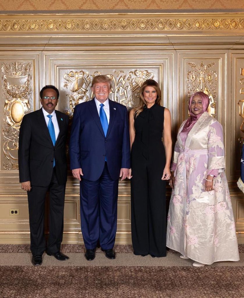 “Madaxweynaha Soomaaliya Maxamed Cabdullaahi Farmaajo iyo Marwada Koowaad ee dalka Marwo Zaynab Cabdi Macalin ayaa ka qeyb galay kulan soo dhaweyn ah oo uu Madaxweynaha Mareykanka Mudane Donald Trump u sameeyay madaxdii kasoo qeyb gashay Meertada 74-aad ee Golaha Qaramada Midoobay…” ayaa lagu yiri qoraal kasoo baxay Madaxtooyada Soomaaliya.