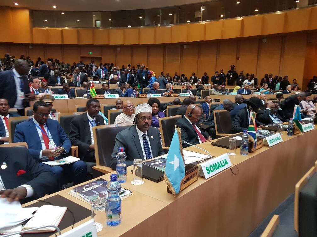 Madaxweynaha ayaa khudbaddiisa ku bilaabay mahadcelin uu u jeediyey Madaxweynayaasha kasoo qeyb galay shirka, isagoo sidoo kale bogaadiyey hiigsiga Afrika ee sanadka 2063, kaas oo isku xiri doona Afrika, una yeeli doona awood dhaqaale iyo mid horumar.