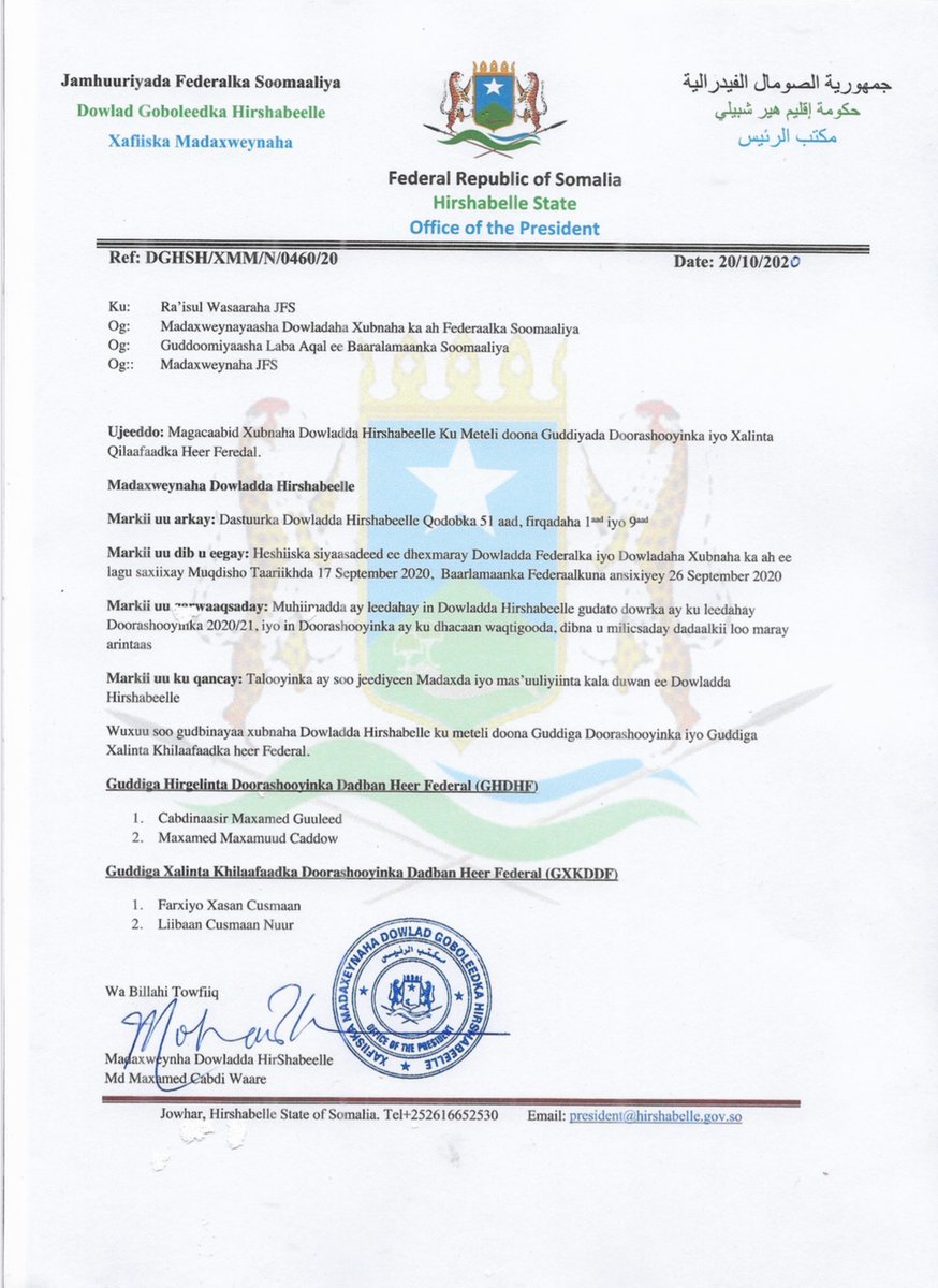 Madaxweynaha Hirshabeelle oo waqtigu ka dhammaaday Maxamed Cabdi Waare ayaa ugu danbeyn magacaabay xubnaha Guddiyada Doorashooyinka ee Maamulka Hirshabeelle.