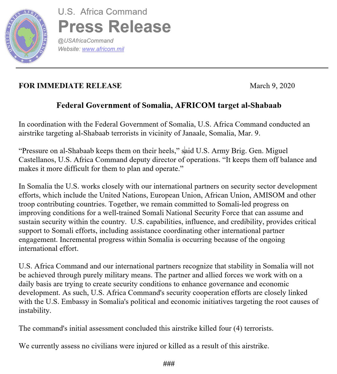 Taliska Ciidamada Marrykanka ee AFRICOM iyo Wasaaradda Warfaafinta Soomaaliya ayaa War-saxaafadeedyo kasoo saaray duqeyn cusub oo maanta ka dhacday degaanka Jannaale ee Gobolka Sh/Hoose.
