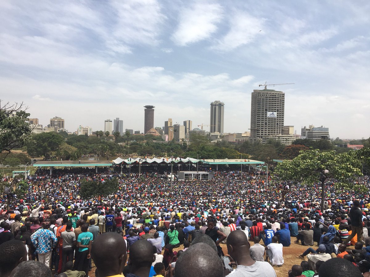 Uhuru Kenyatta ayaa hore loogu dhaariyey madaxweynaha Kenya markii labaadMar sii horeysay booliiska ayaa isku xeendaabay beerta Uhuru Park, balse markii dambe ayay firaaqeeyeen. Raila ayaa sheegay in uu isaga ku guuleystay doorashadii dhacday bishii Agoosto ee sanadkii hore.