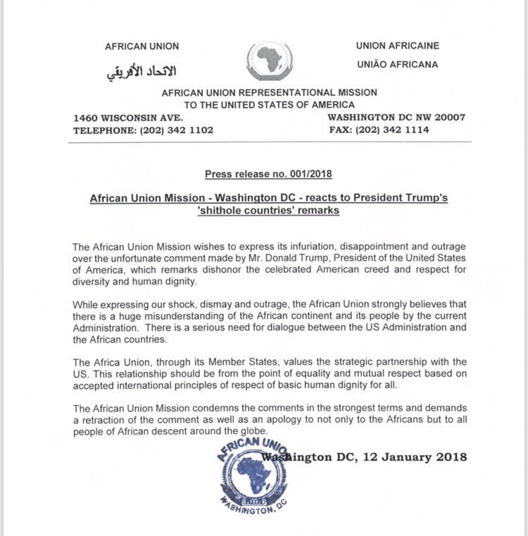 Wakiilada Midowga Afrika ee ku sugan caasimada Mareykanka ee Washington, ayaa muujiyay sida ay “uga xun yihiin, ugana careysan yihin oo ay u diidan yihiin” hadalkii la sheegay inuu kasoo yeeray Trump, taasi oo ay ku sheegeen inay xaqiijineysa in maamulka Mareykanka uu si qalad ah u fahmay qaarada Afrika.