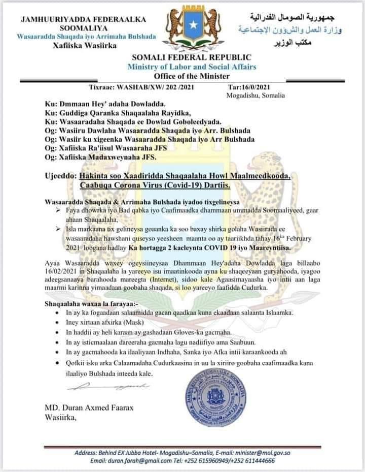 Wasaaradda shaqada iyo arrimaha Bulshada xukuumadda xilgaarsiinta ee Soomaaliya ayaa shaqaalaha dowladda fartay inay joogaan guryahooda, iyadoo si KMG ah loo hakiyay isku imaatinka shaqaalaha iyo xaadirintooda, taasoo sabab looga dhigay cudurka Covid-19 ee soo laba kacleeyay.