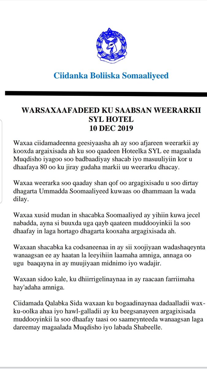 Taliska ciidamada Booliska Soomaaliyeed ayaa War-saxaafadeed kasoo saaray weerarkii Dabley ka tirsan Alshabaab xalay ku galeen Hotelka SYL ee magaalada Muqdisho.