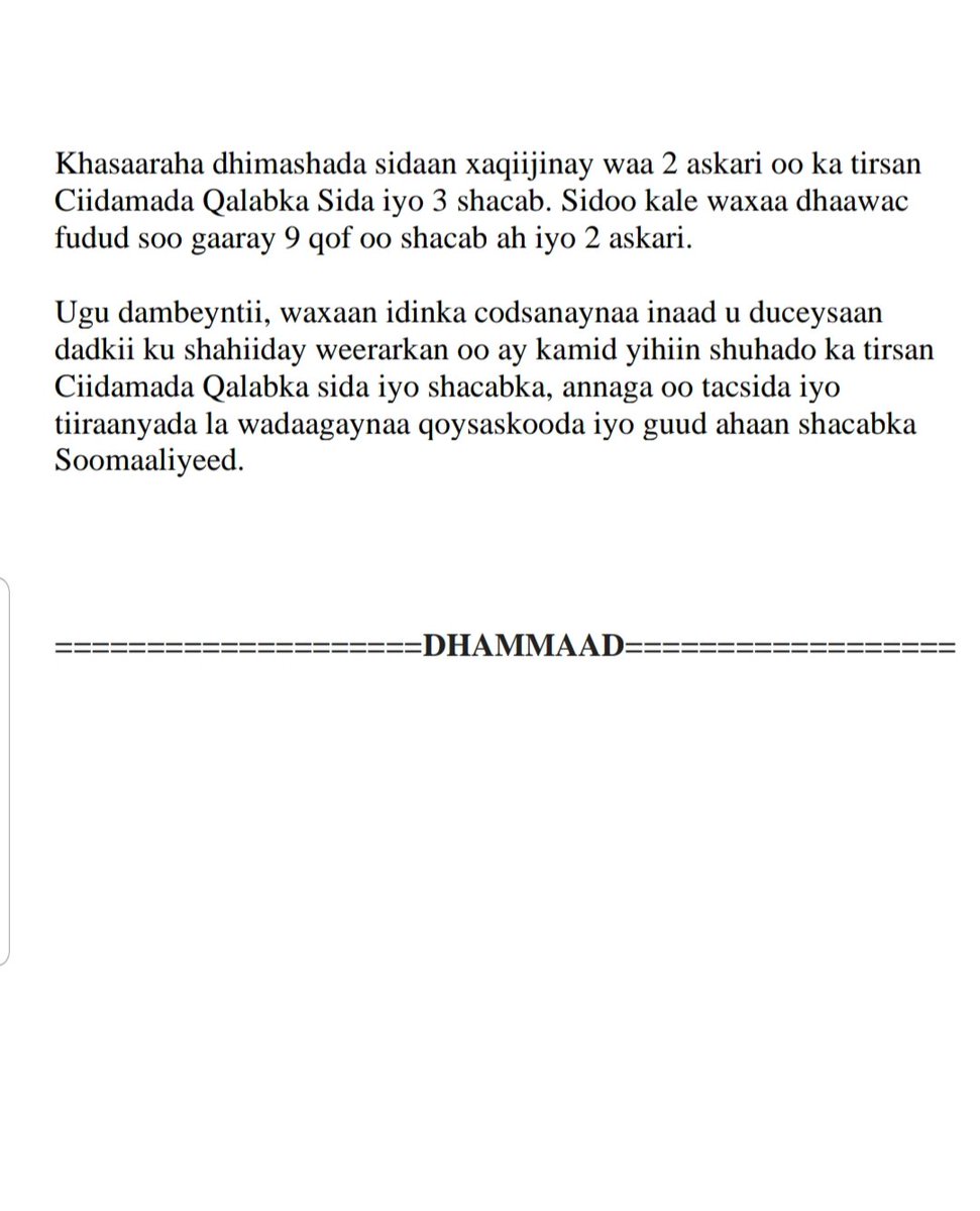 War-saxaafadeedka ayaa lagu sheegay in la dilay dhammaan 5-tii dableyda ahayd ee argagixisada Alshabaab, isla markaana qaraasaha ka dhashay weerarka inta la xaqiijiyey uu yahay 5 qof oo isugu jira 3 shacab ah iyo 2 askari, halka lagu dhaawacay 11 oo 9 ka mida ay shacab yihiin iyo 2 askari.
