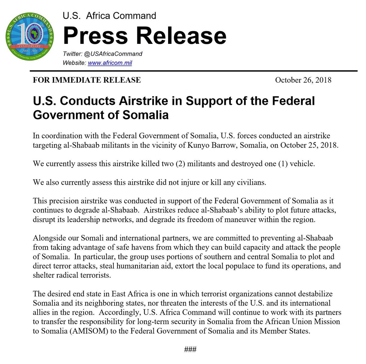 Taliska Ciidamada Mareyanka ee Africa (AFRICOM) ayaa shaaciyey inuu fuliyey duqen dhinaca cirka ah iyadoo uu la kaashadya dowladda Federaalka Soomaaliya.
