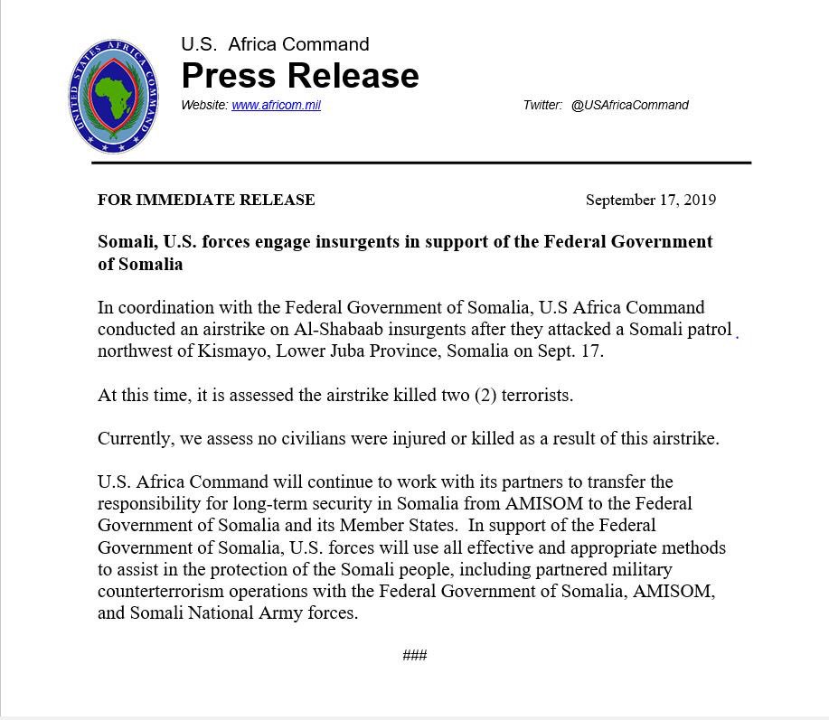 Taliska ciidamada Mareykanka ee AFRICOM ayaa war kasoo saaray howlgal duqeyn ah oo ka dhacay duleedka magaalada Kismaayo, iyadoo war kale uu hore uga soo saaray taliska Milateriga Soomaaliya.