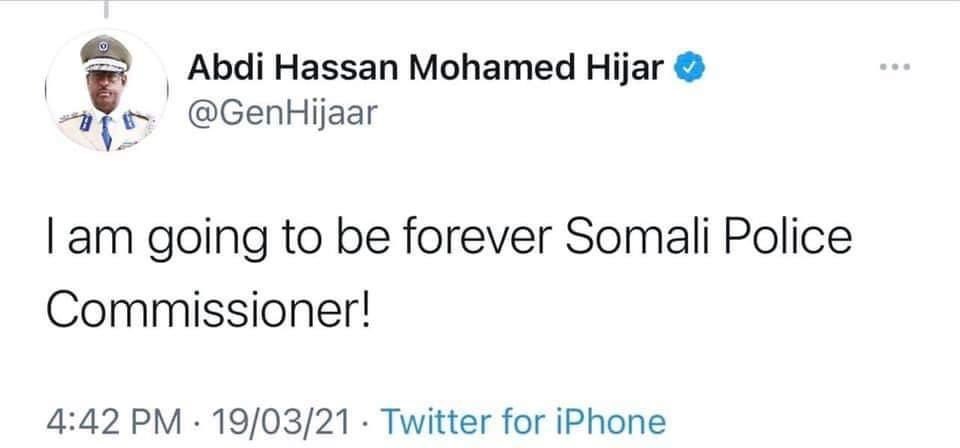 Farriin luqadda Ingiriiska ku qoran ayaa lagu arkay barta Twitter-ka ee Jeneraalka, taasoo u qorneyd: “Weligey waxaan ahaan doonaa Taliyaha Booliska”, inkastoo barta twiterka ee Jeneraal Xijaar aanay dad badan ku xirneyn ayaa shaki laga muujiyey sida loo jabsaday, iyo sida lagu soo celiyay.