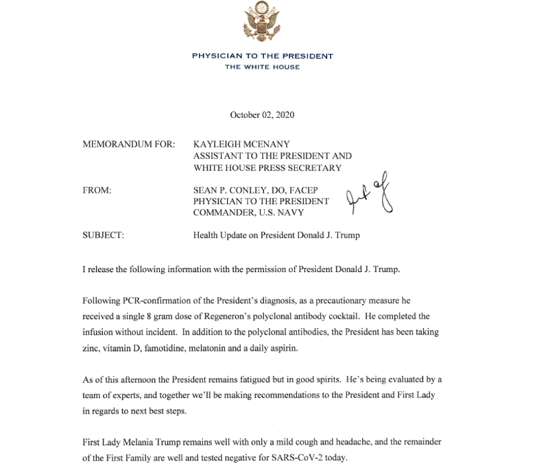 Qoraal uu faafiyey Dhaqtarka Madaxweyne Trump goor dhoweyd ayaa lagu sheegay in xaaladda Madaxweyne Trump uu dareemayo Daal weyn, waxaana lagu duray Daawo xoojisa difaaca jirka ee (Regeneron’s polyclonal antibody cocktail) oo looga hortago inuusan cudurka Coronavirus saameyn weyn ku yeelan qofka uu ku dhaco.