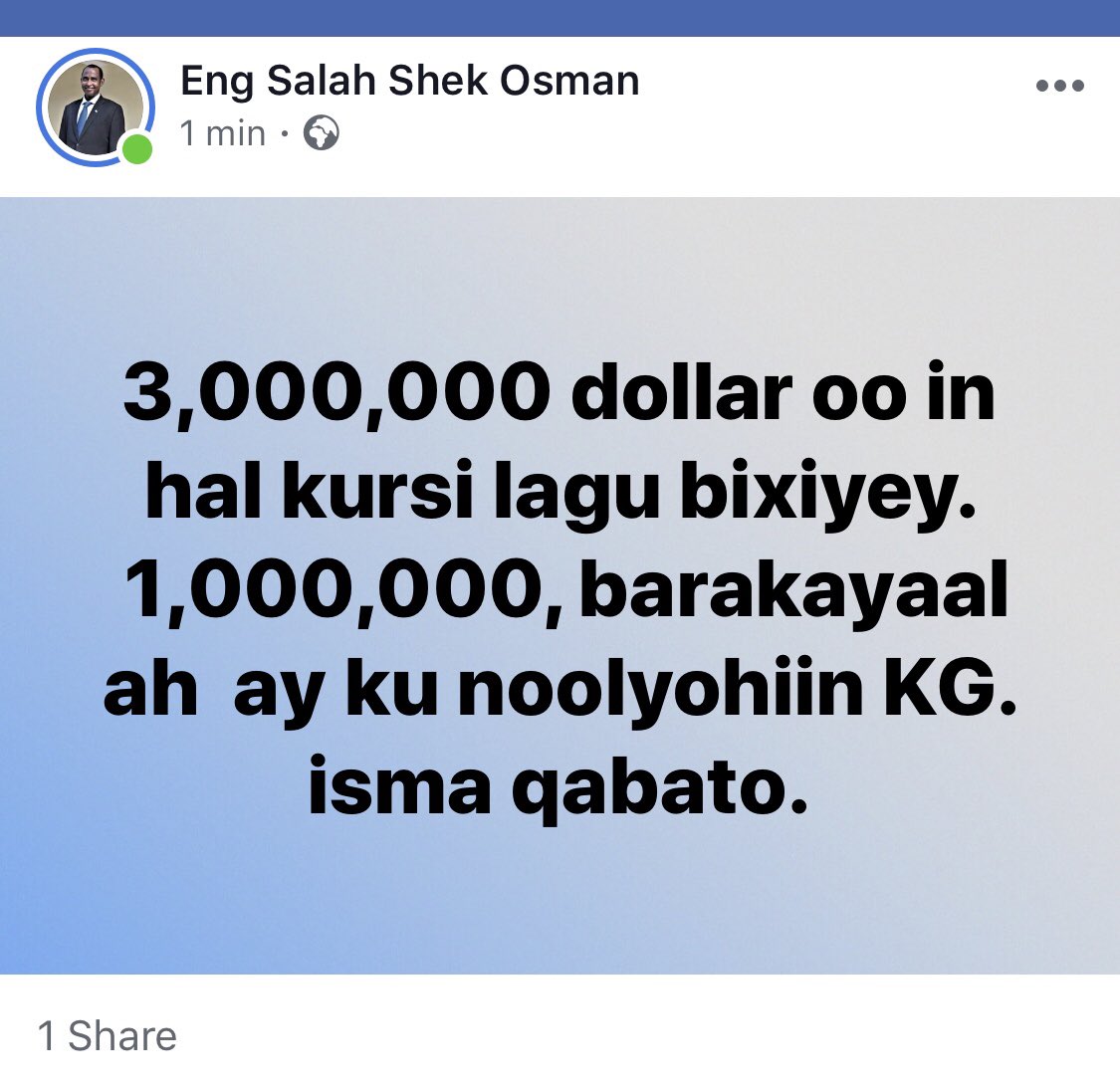 Eng. Saalax Sheekh Cusmaan ayaa sheegay in dowladda Soomaaliya ee uu hoggaamiyo Madaxweyne Farmaajo ay lacag gaareysa 3,0000,000 (Saddex Milyan oo Doolar) ku bixisay Doorashada Kursiga Madaxweynaha Maamulka K/Galbeed oo maanta uu ku soo baxay musharaxii ay dowladu wadatay ee C/casiis Xasan Maxamed (Lafta-gareen).