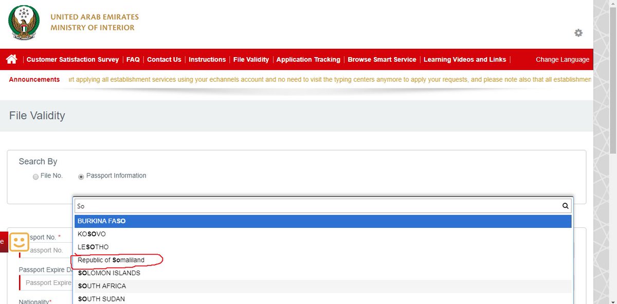 Bogga Wasaaradda Arrimaha Gudaha Imaaraadka ayaa lagu soo daray magaca “Somaliland Republic” oo ku jira dalalka dalban kara adeegga wasaaradda oo ay ku jiraan Dal-ku-galka, iyadoo Somalia laga saaray liiskaasi, waxaana madaxtooyada Somaliland laga soo xigtay inay Imaaraadka ay bilaabeen Dal-ku-gal ay ku bixinayaan Baasaboorka Somaliland.